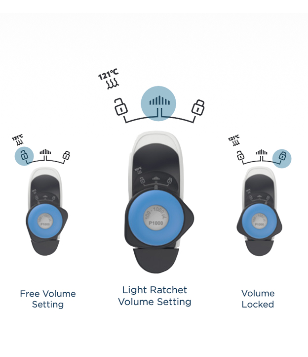 ● Posición de bloqueo de volumen para un pipeteo seguro Con este nuevo sistema Trilock™, el volumen se ajusta simplemente girando el botón de la pipeta.