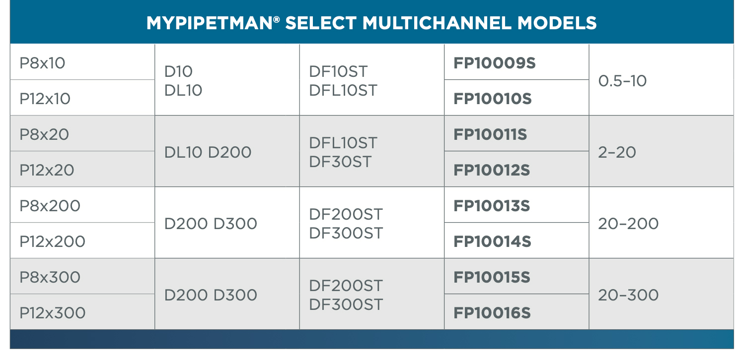 MY PIPETMAN® Ergonómico, seguro y confiable, My PIPETMAN® Select ofrece opciones de configuración de volumen y personalización de texto opcional en el mango para un uso óptimo en varios protocolos.