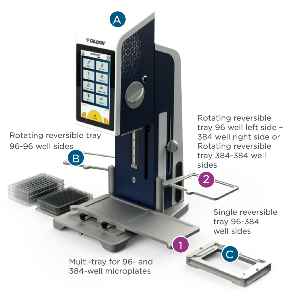 PIPETMAN® M96 GILSON es una pipeta electrónica de desplazamiento de aire cómoda e intuitiva para el pipeteo de alto rendimiento en microplacas de 96 y 384 pocillos.